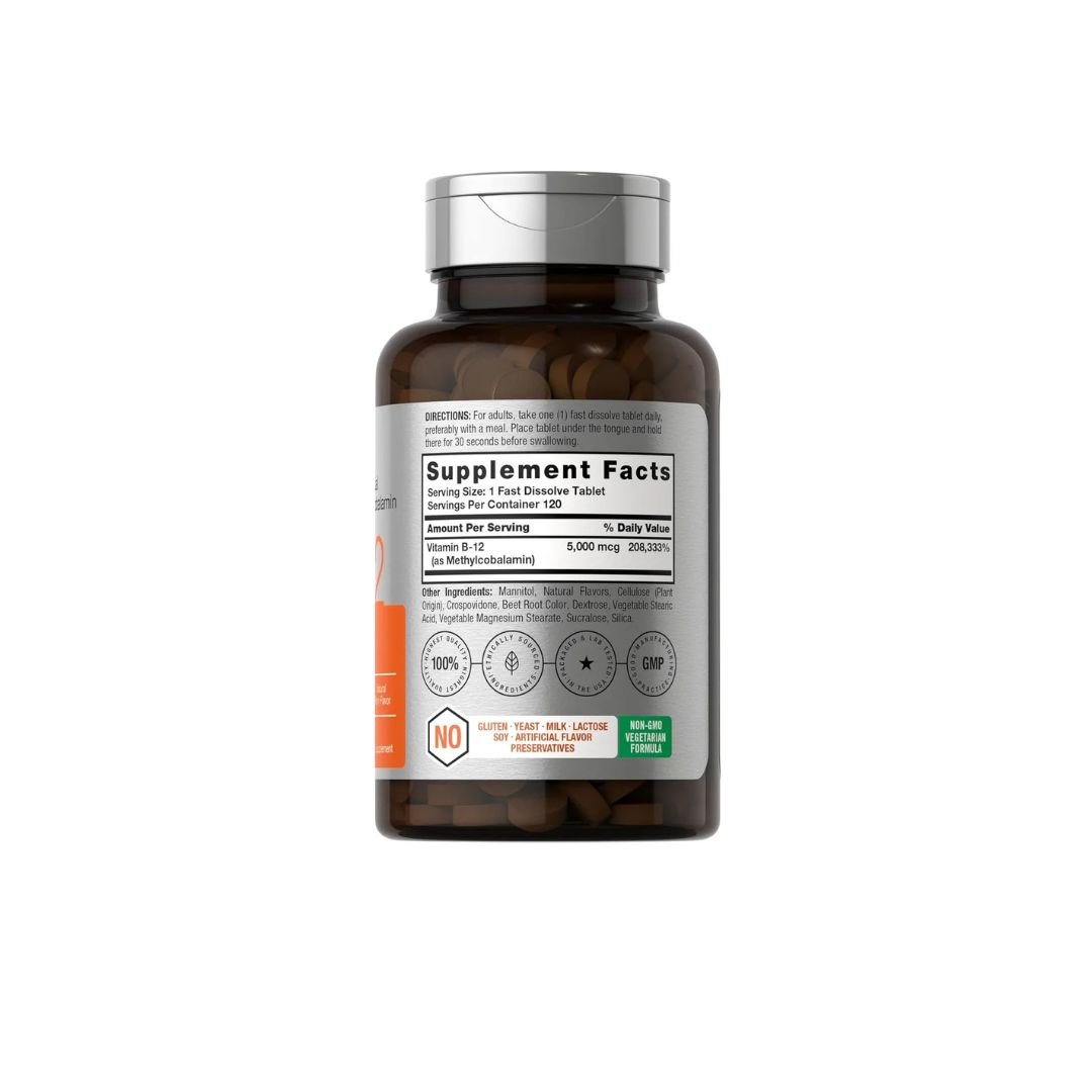 B-12 es una vitamina natural que ayuda a mantener la función metabólica adecuada y los niveles de energía celular al ayudar a convertir los alimentos en energía.
